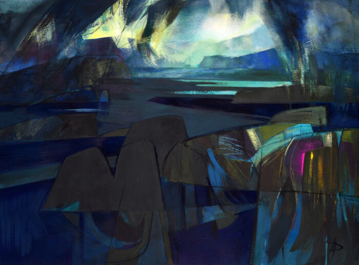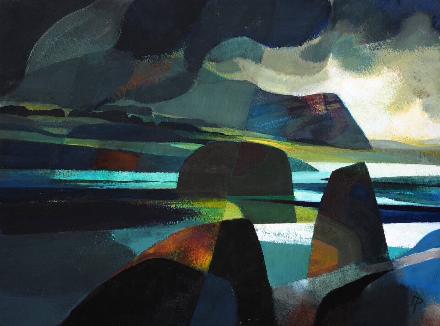 I love using watercolour for its fluidity and translucency. It is also easily transportable. Many years ago, the majority of my work was painted en-plein air. They were usually small spontaneous paintings, that I hoped would capture my excitement, and that particular magical light witnessed only in the Hebrides. Watercolour is the perfect medium to capture this fleeting light, and although I still immerse myself in the landscape from time to time, I feel I can achieve another dimension when I am in the studio; it affords me more time to reflect and a free rein to experiment.